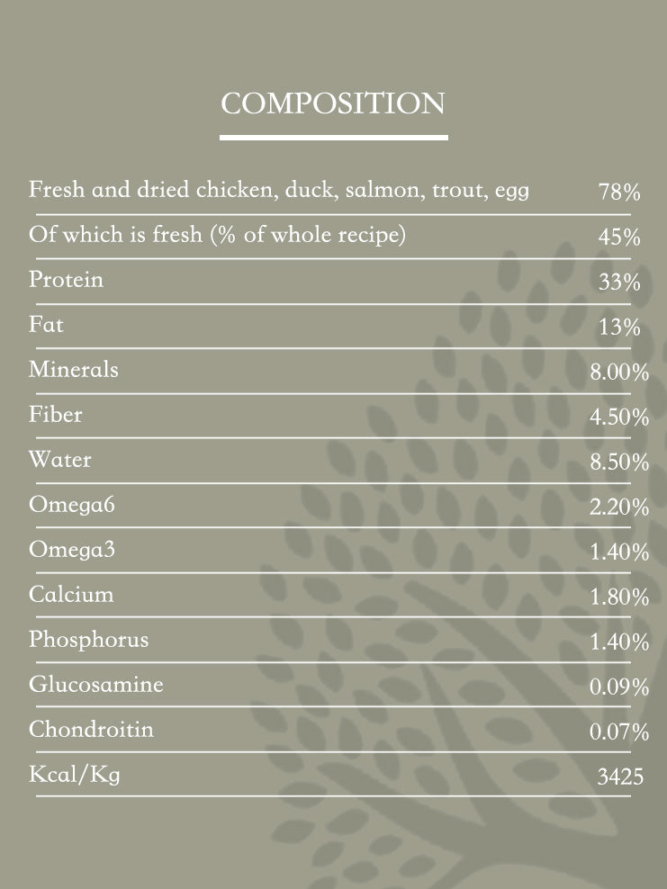 Fresh chicken and duck (35%), dried chicken and duck (33%), sweet potato, potato, peas, fresh salmon and trout (5%), whole egg (3%), linseed, lucerne sprout, chicken liver gravy (2%), pea fibre, vitamins, minerals, MOS, FOS, glucosamine, chondroitin, cranberry, acai, bilberry, mulberry, apple, tomato, orange, pear, carrot, spinach, cauliflower, seaweed, marigold, ginseng, green tea, ginger. Total meat ingredients 78%.