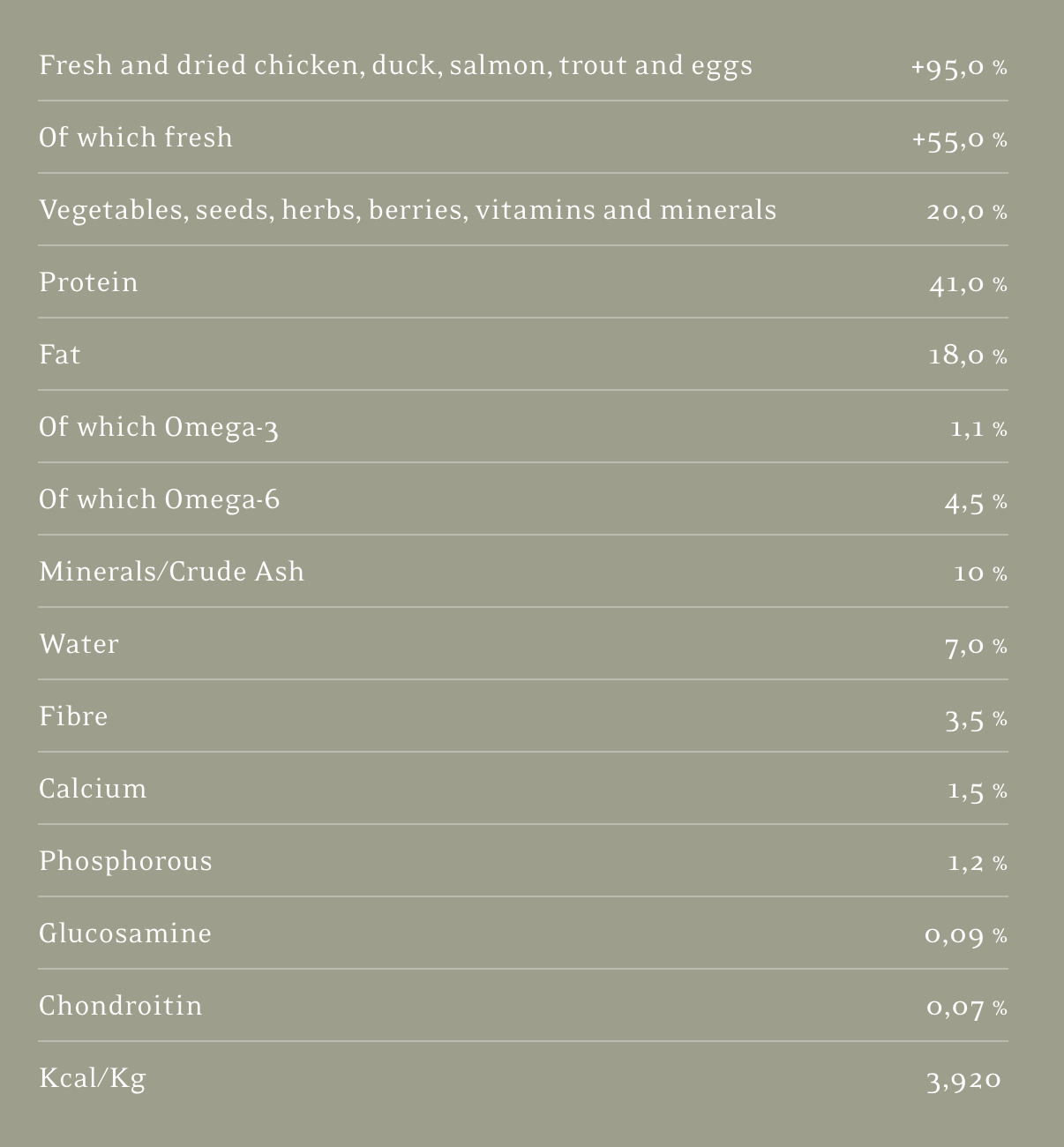Made with minimum 95% chicken‚ duck‚ salmon, trout and eggs