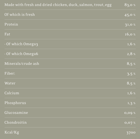 Made with 83% fresh & dried chicken‚ duck‚ salmon, trout and eggs