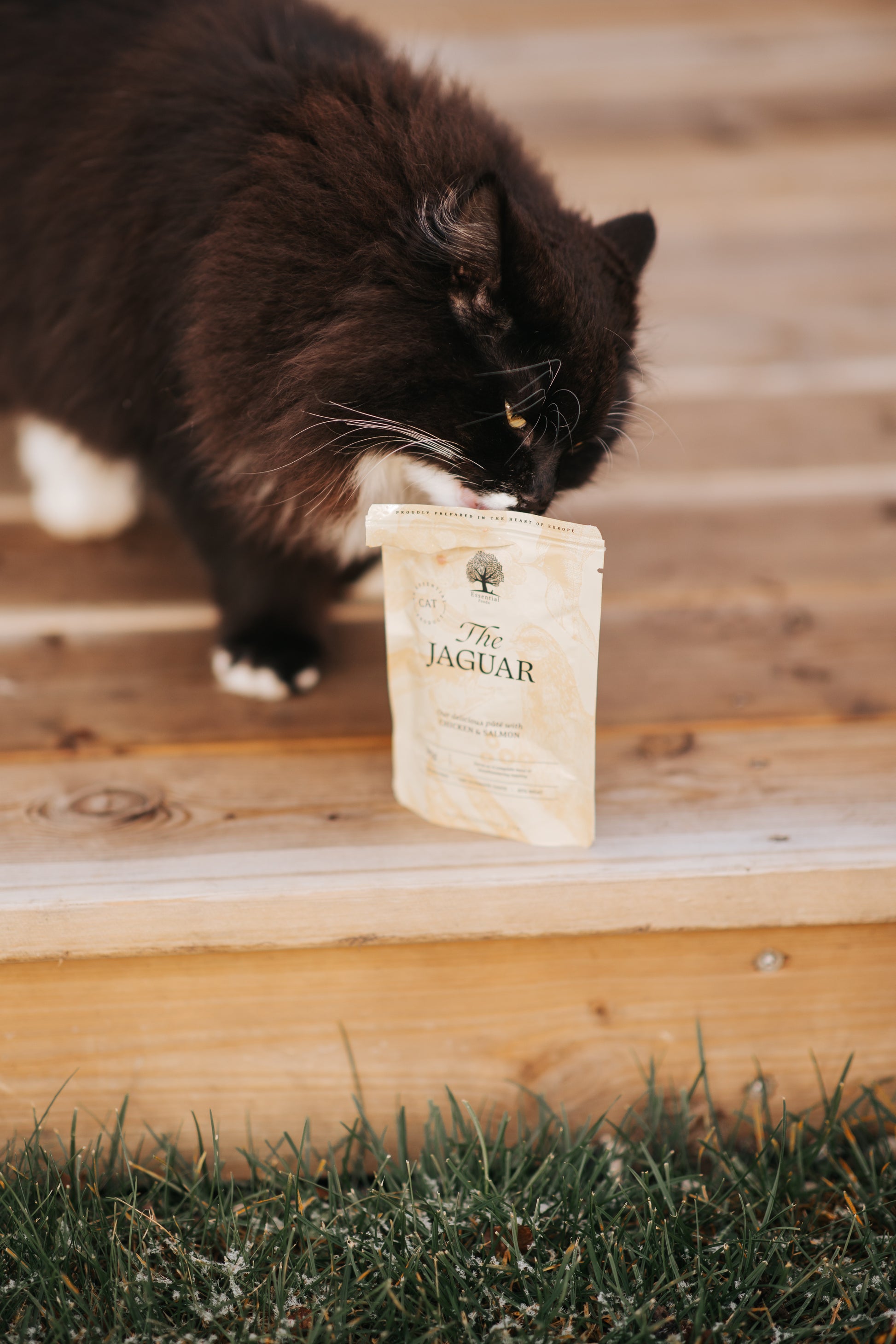 ESSENTIAL the JAGUAR PÂTÉ is our exceptionally delicious dish with cuts of chicken fillets in a thick gravy with salmon. It’s 85% meat – pretty amazing! Can be served as a complete meal or as a mouthwatering topping for adult cats seeking the very best.
